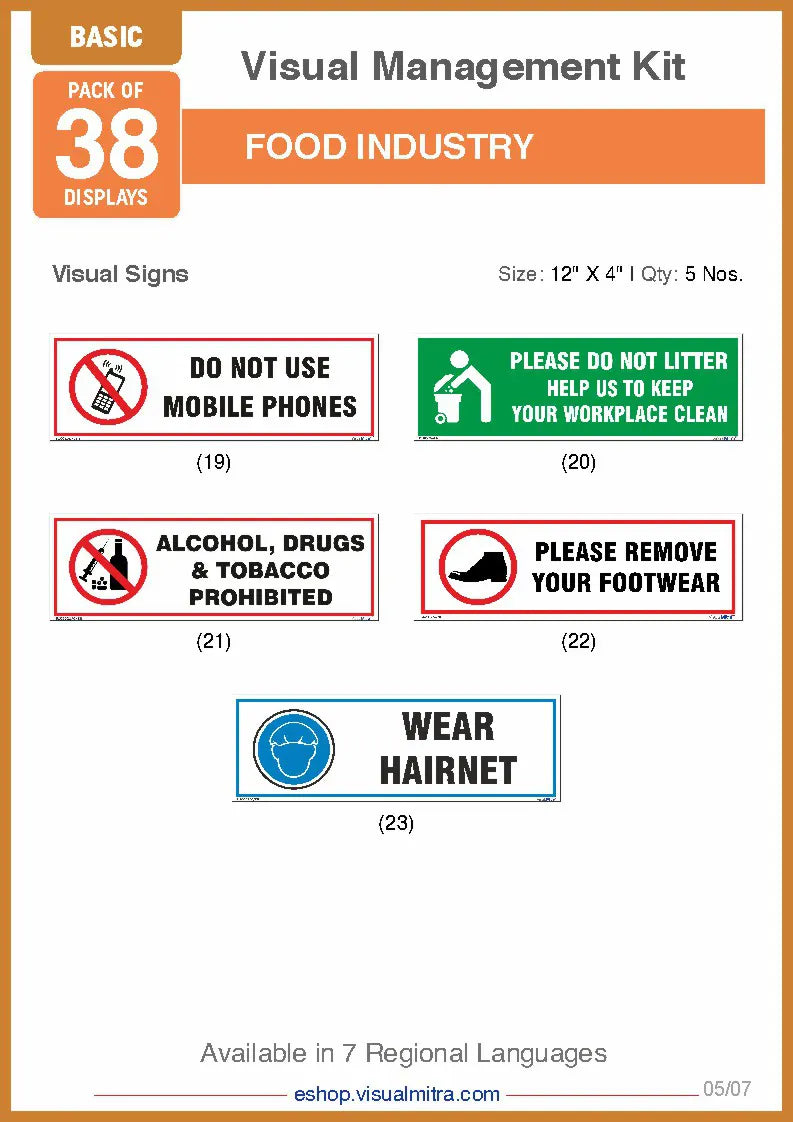 Ensure safety and hygiene in your food processing facility with the Food Industry Visual Management Kit - Basic Kit. Ideal for small kitchens or designated areas in larger plants, this kit is designed to uphold food safety standards while improving operational efficiency.