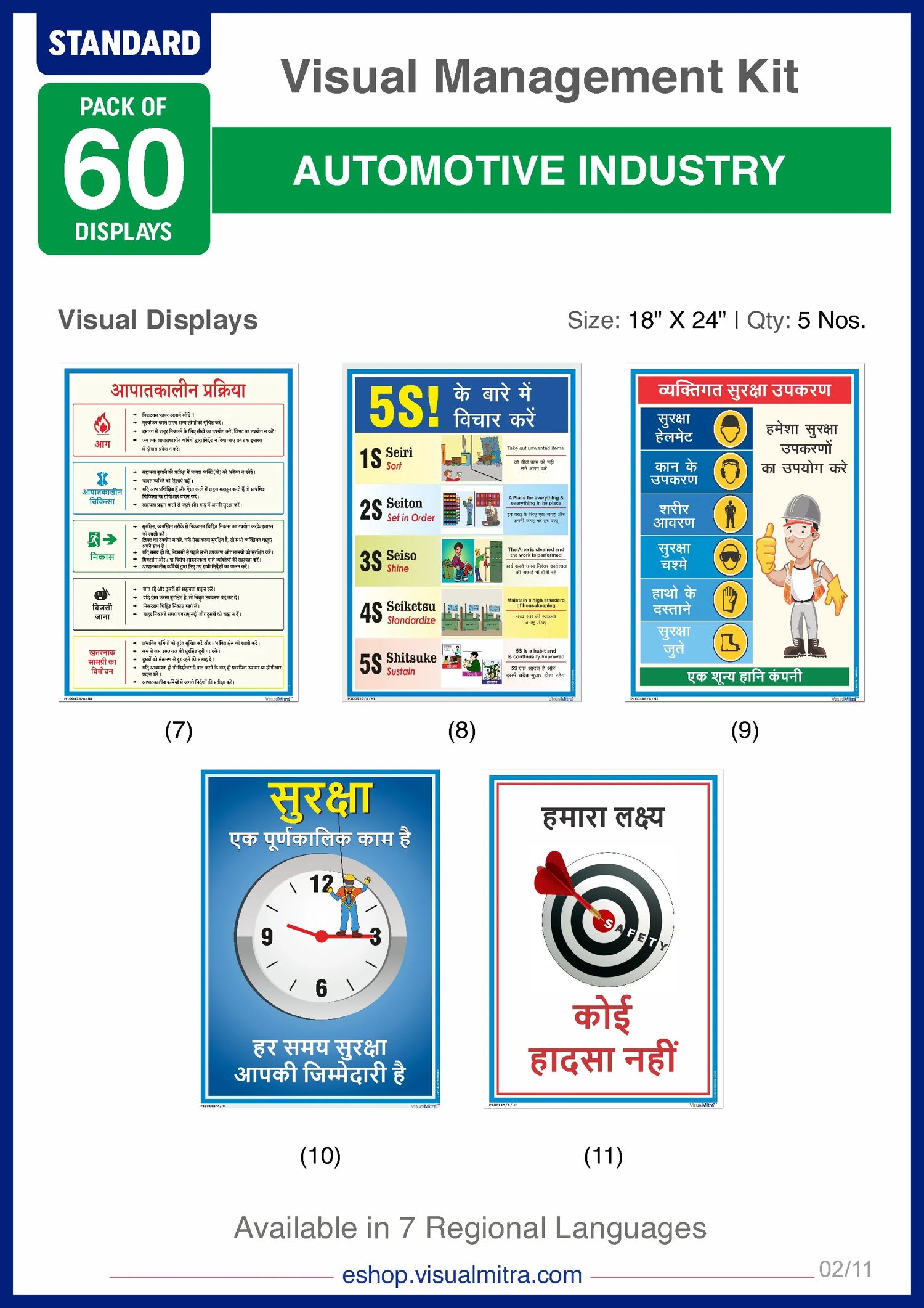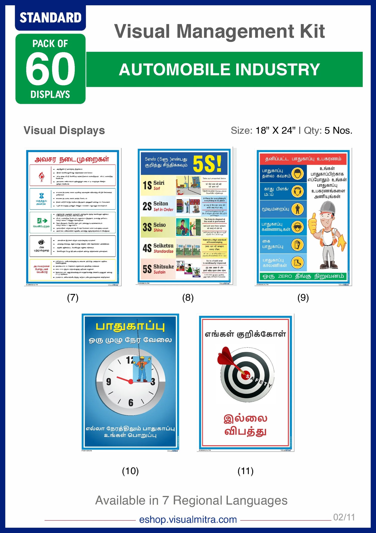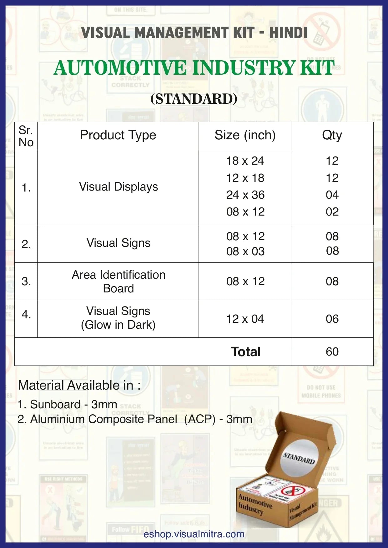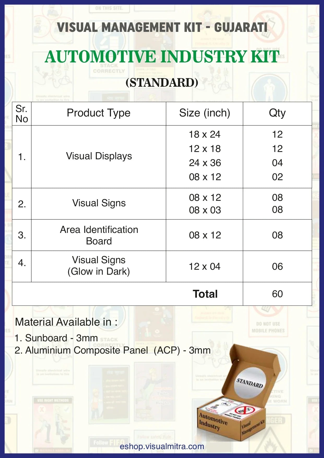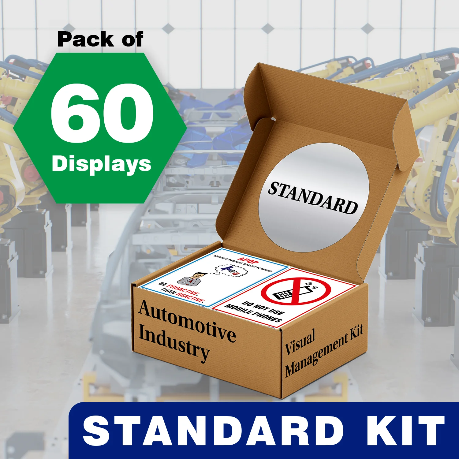 - Standard Coverage: With 60 Visual Displays covering a broad range of visual management needs, the Standard Kit provides a complete solution for any Automotive facility.