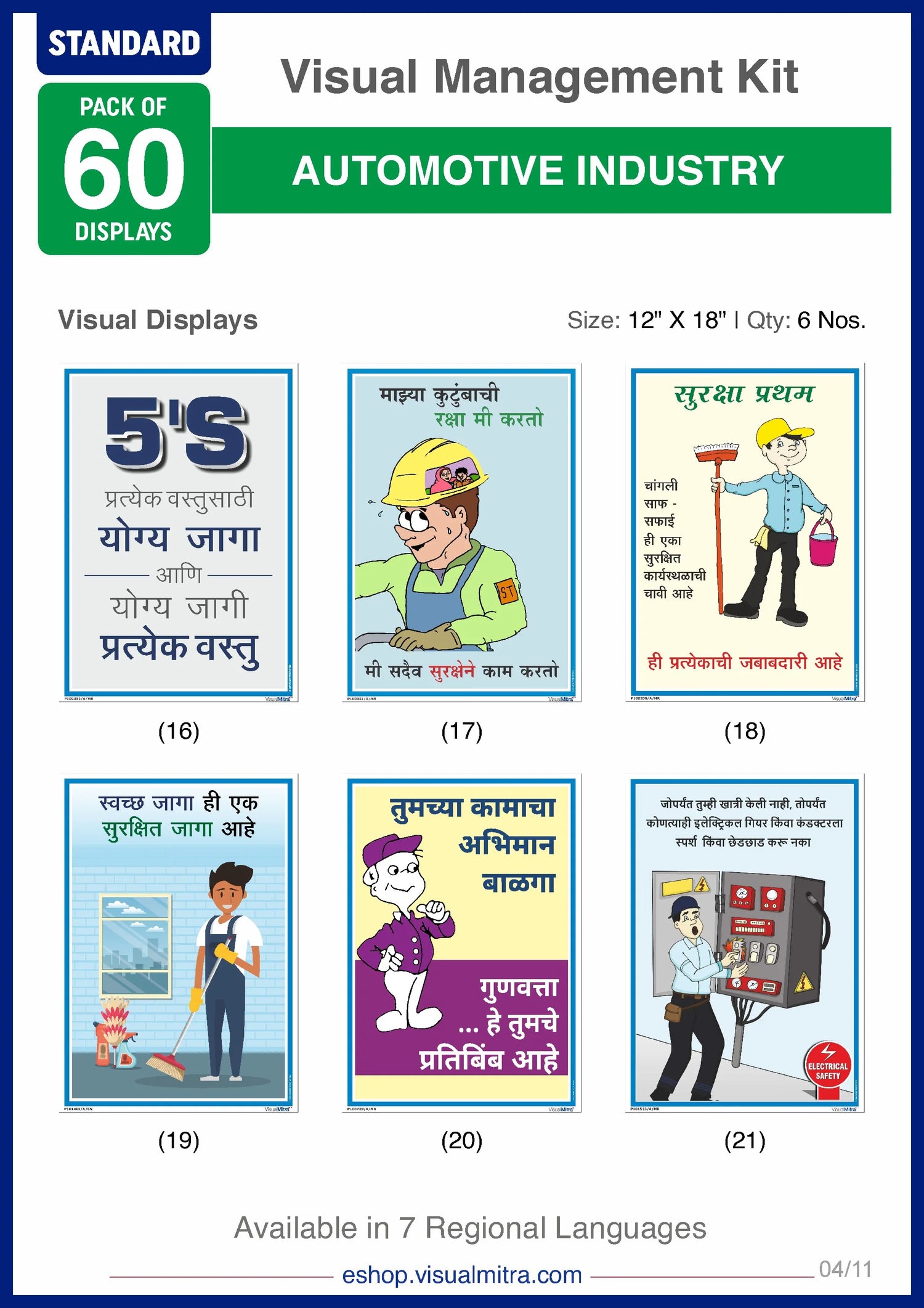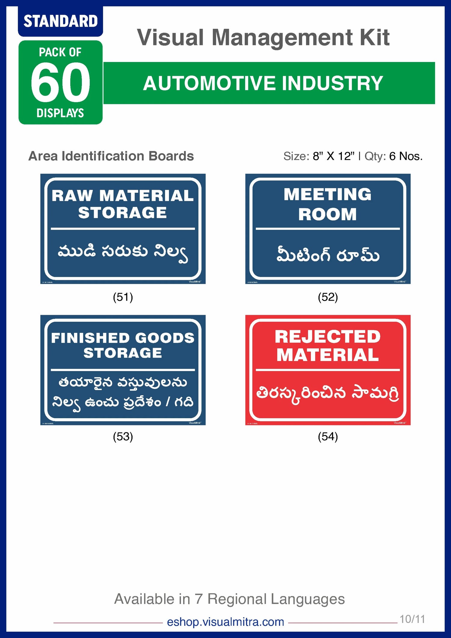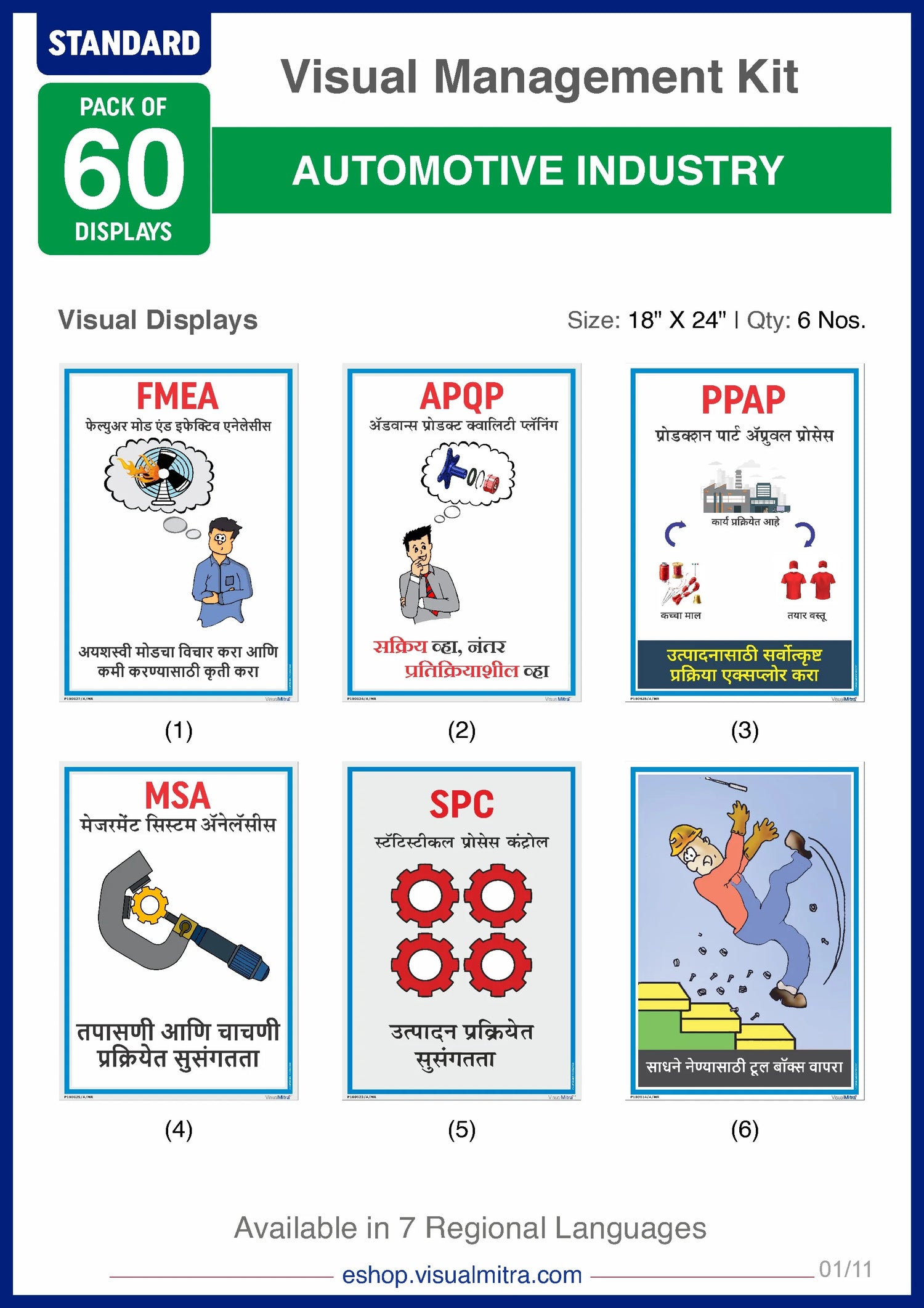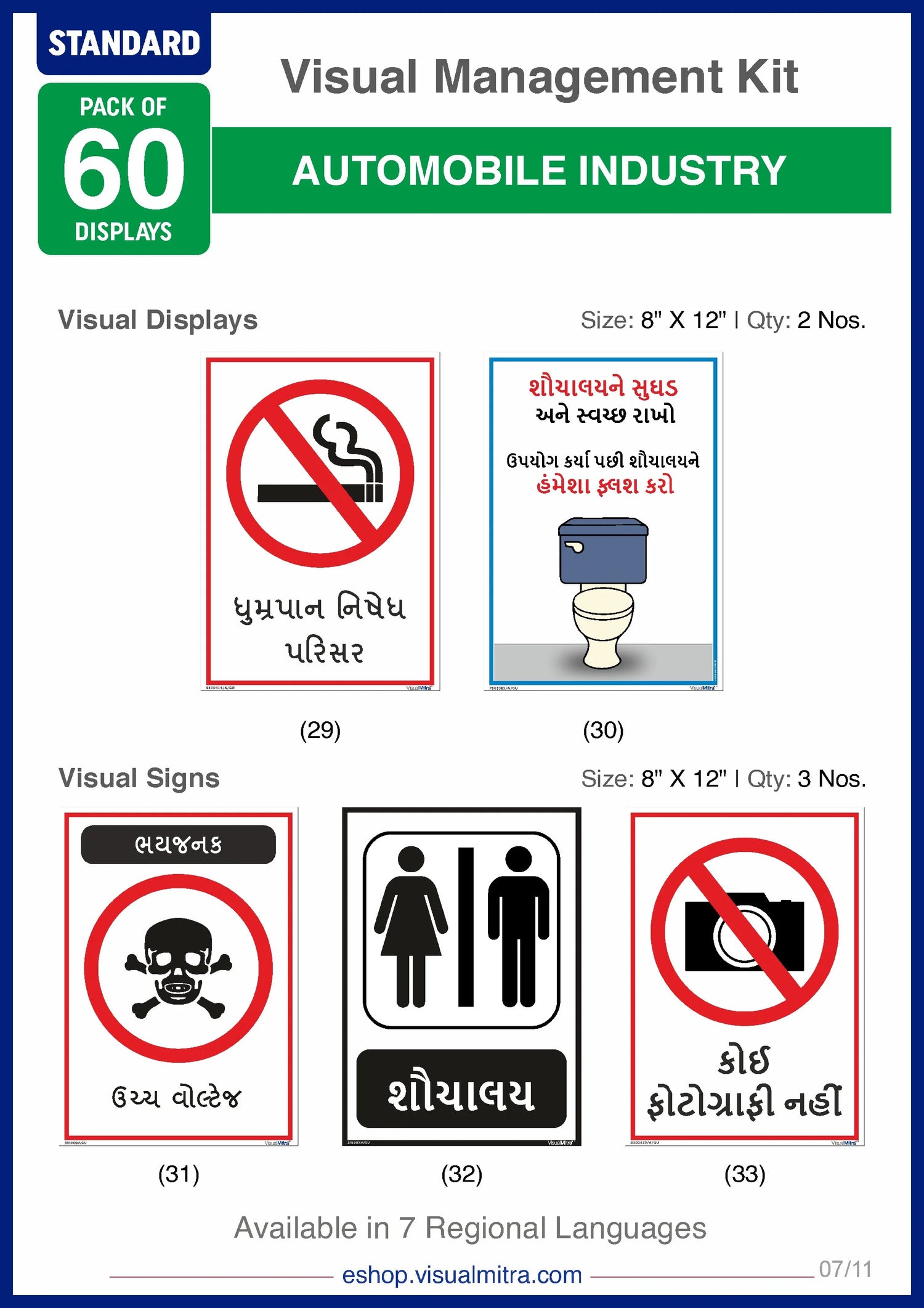 - Standard Coverage: With 60 Visual Displays covering a broad range of visual management needs, the Standard Kit provides a complete solution for any Automotive facility.