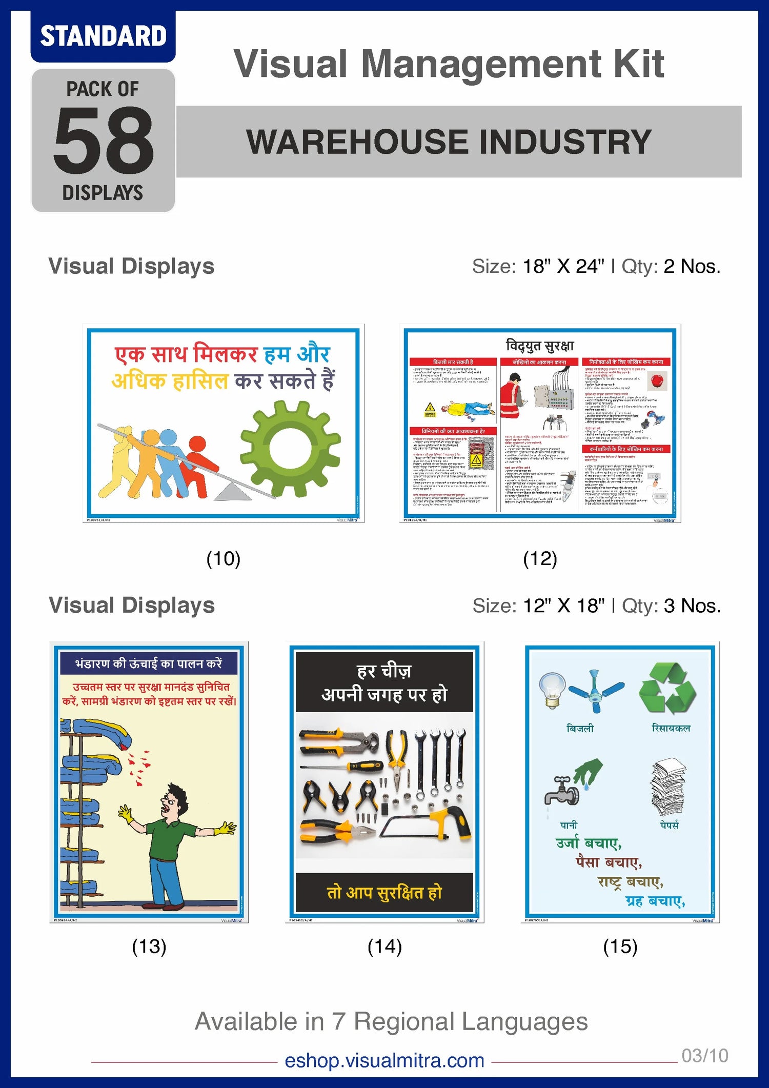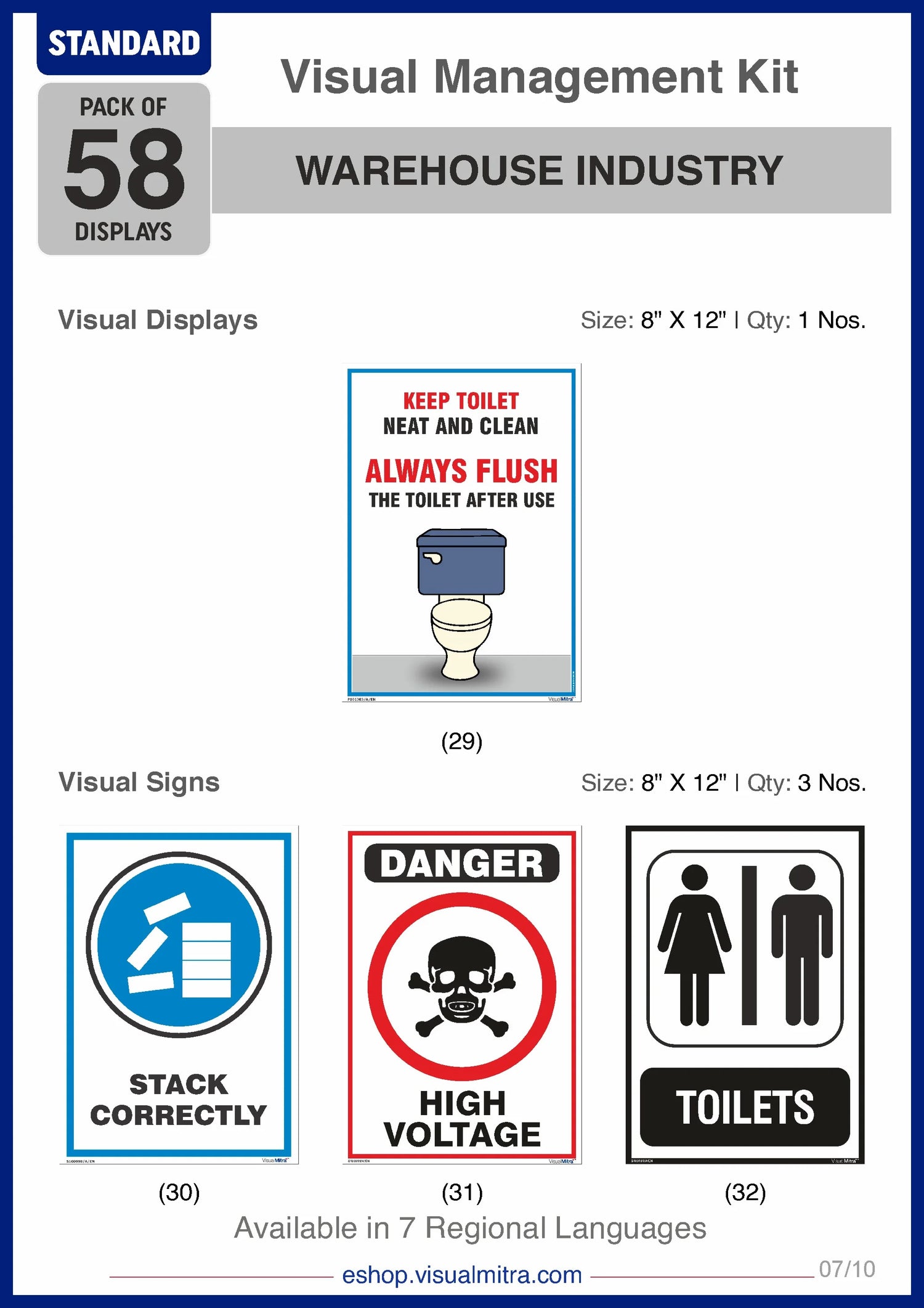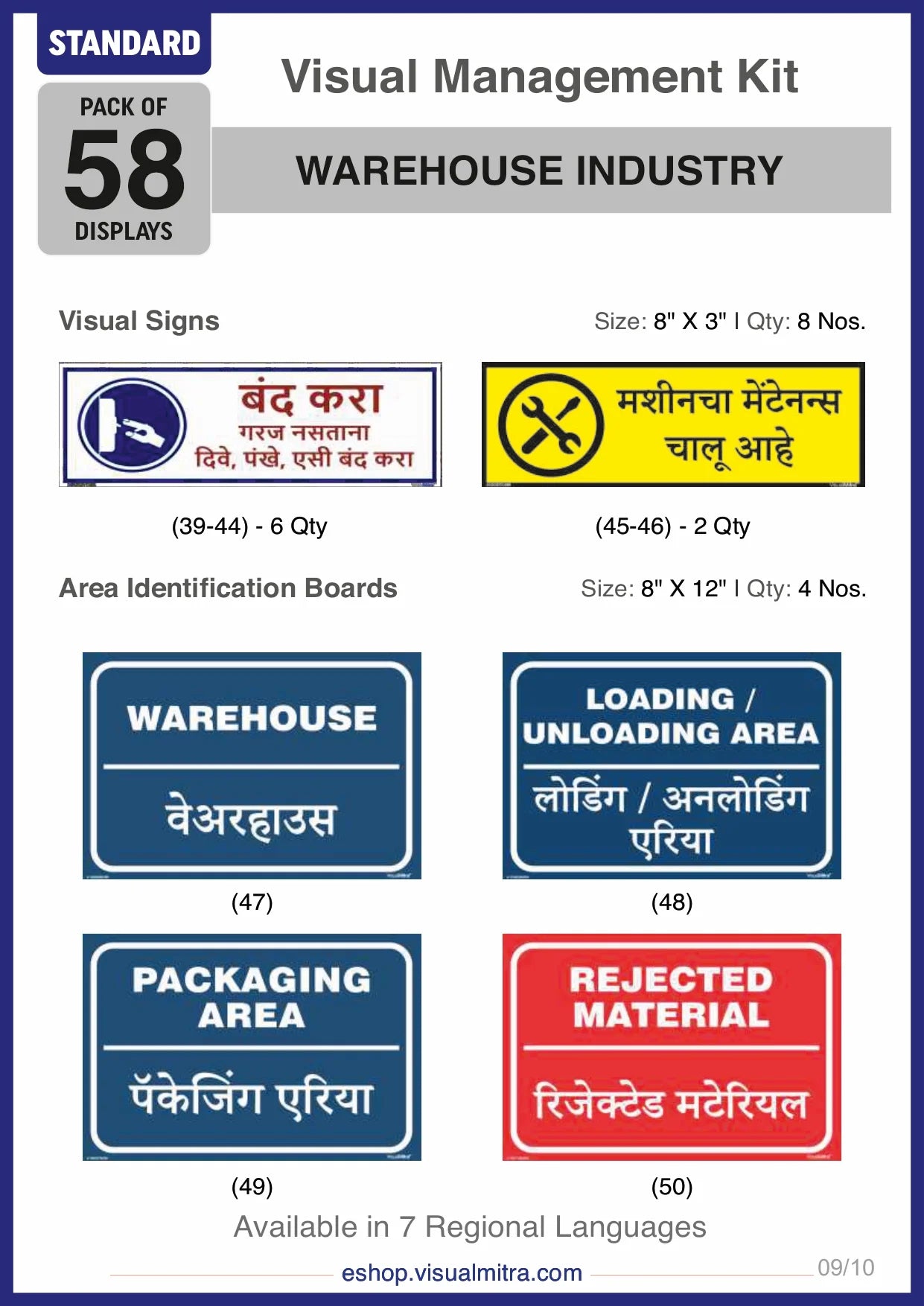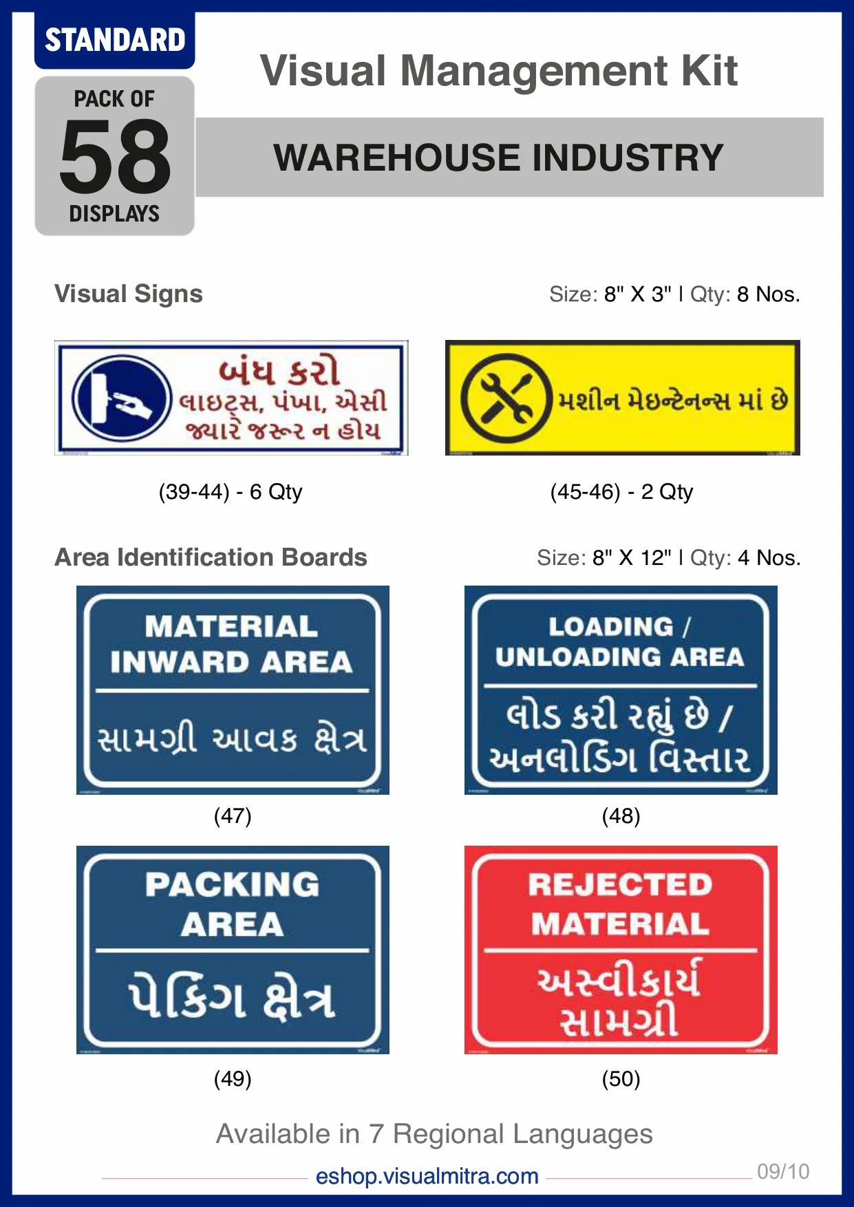 - Standard Coverage: With 59 visual management displays covering a broad range of visual management needs, the Standard Kit provides a complete solution for any warehouse facility.