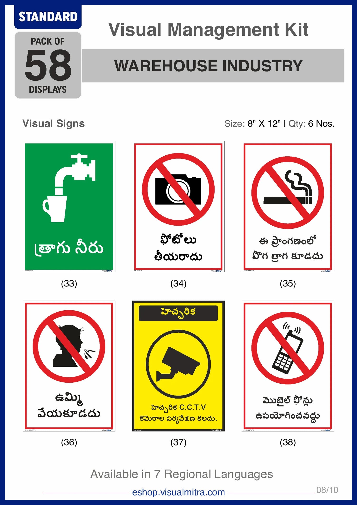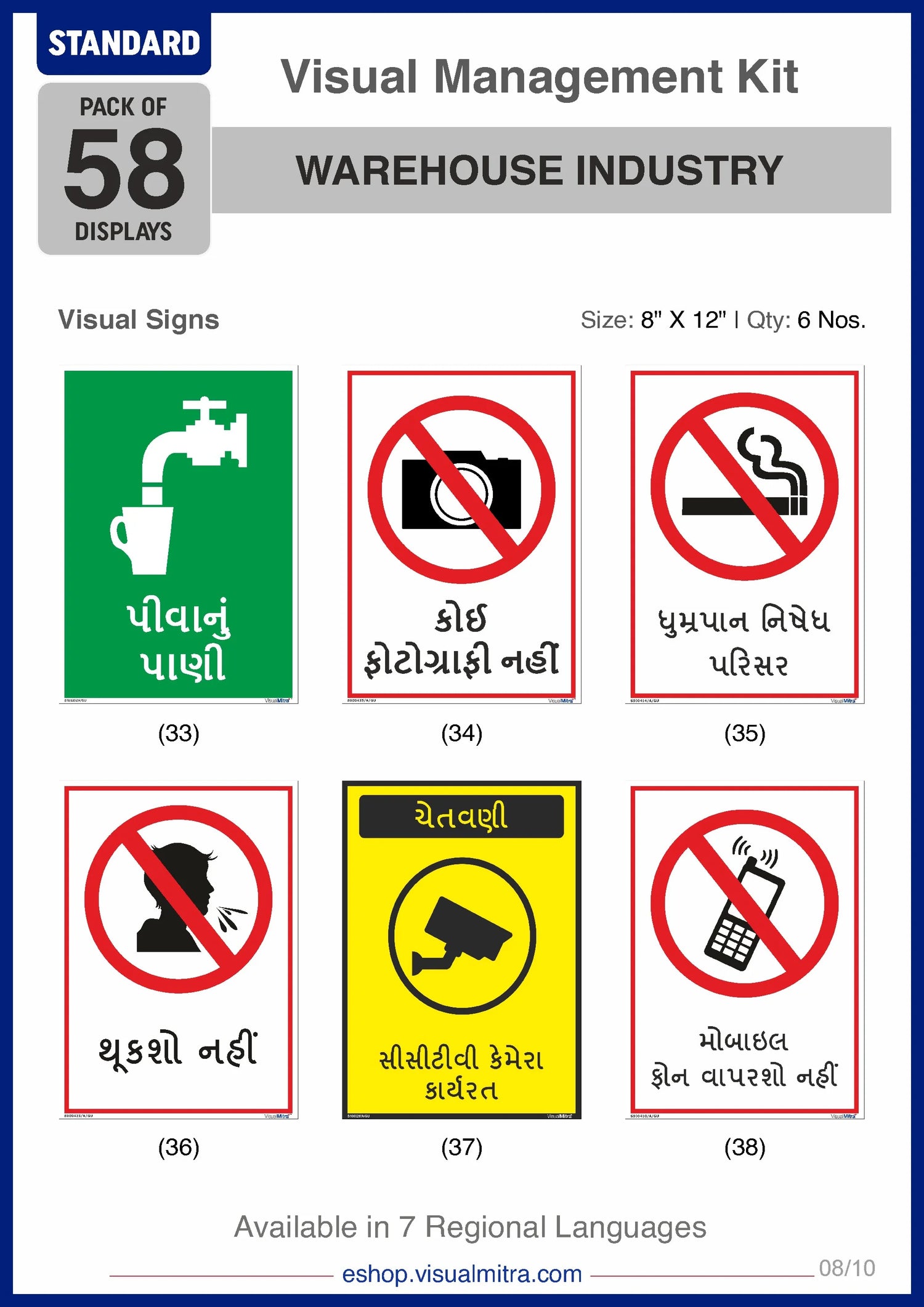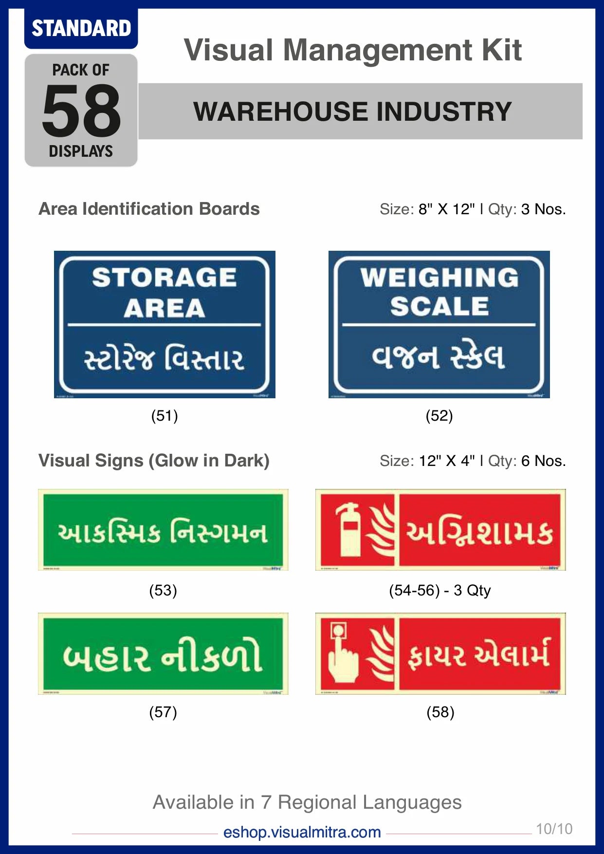 The Standard Kit includes 58 visual Displays, encompassing visual displays, signs, glow-in-dark signs, and area identification boards. Each component is crafted to deliver critical information efficiently and effectively, promoting a well-organized, safe, and productive work environment.